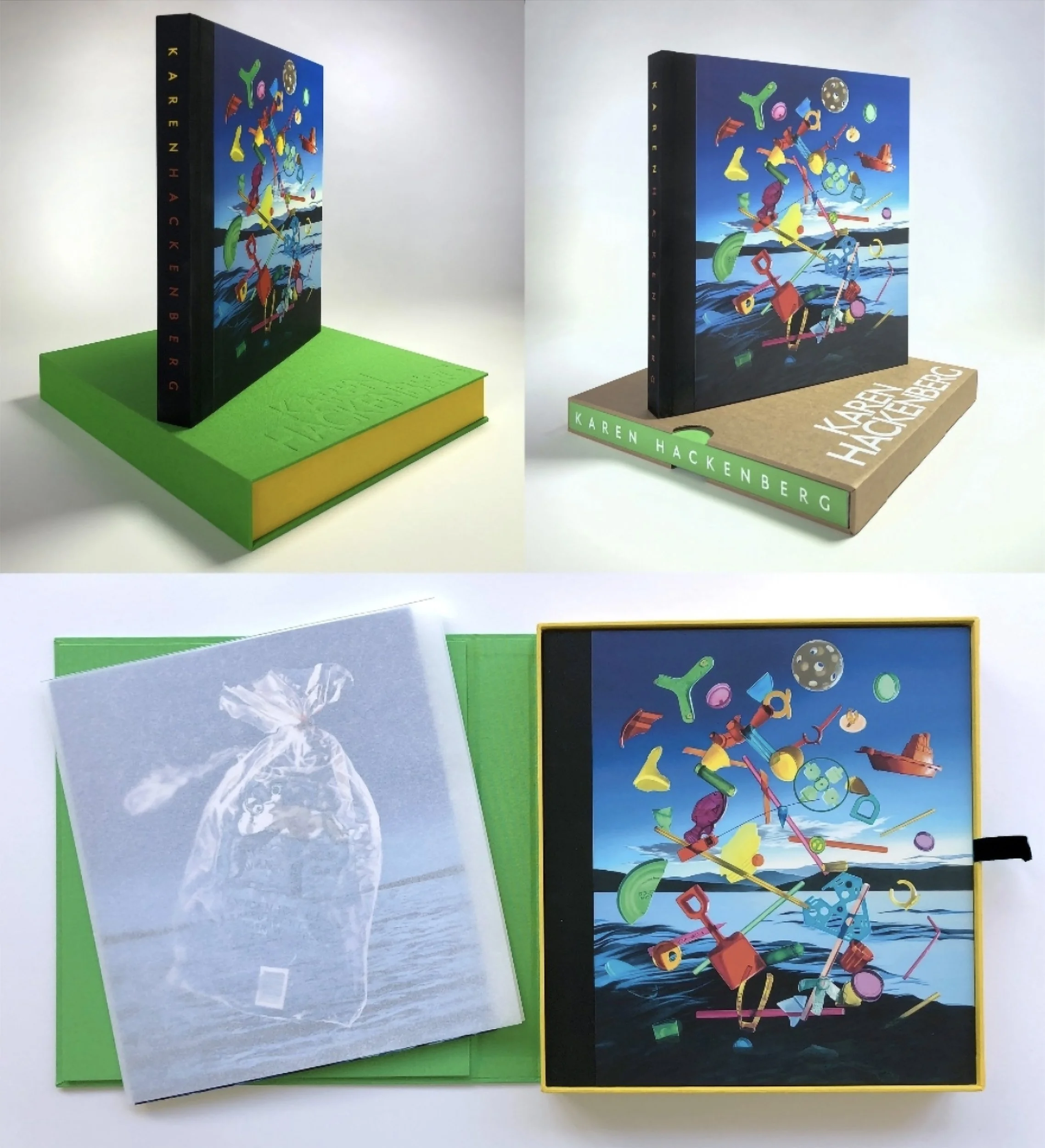 Top left: Linen-covered boxed set of hardcover book (standing upright) and archival print.